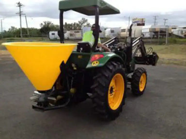 Tractor Fertilizer Spreader FS18 is all steel frame The Yellow 1200mm Hopper Bin is a poly carbonate material and so it will not rust. This is a t...